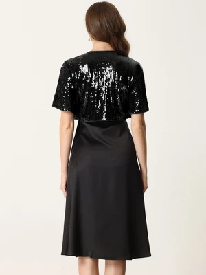 Allegra K Sequin Shrug Bolero for Women’s Flared Sleeve Crop Sparkly Glitter Jacket Sequin Shrug Sparkly Glitter Short Flared Sleeve Crop Length100% Polyester Fabric A sequin shrug bolero with one button closure suit for wearing. Simple and delicate, this sparkly glitter jacket features a flare sleeve, crop length, and shiny fabric. This fall-winter-essential jacket is shaped from suit sparkly fabric for parties, clubs, nights out, etc Simply add tailored trousers or jeans for a chic look.