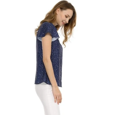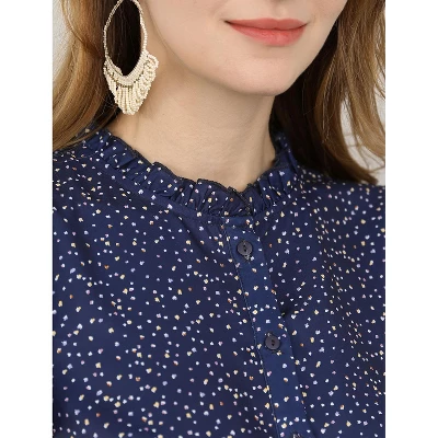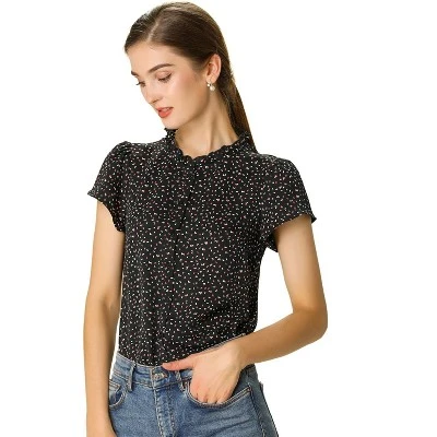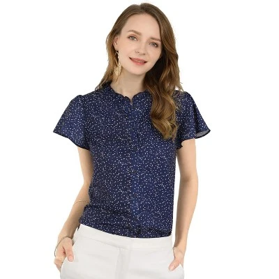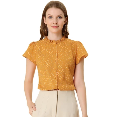 - Ruffled Stand Collar, Flutter Short Sleeve, Dots Print