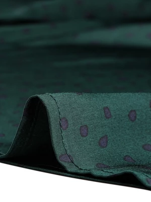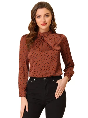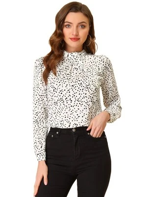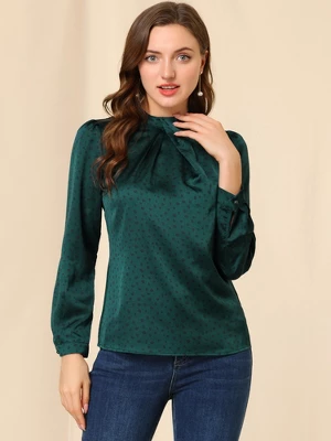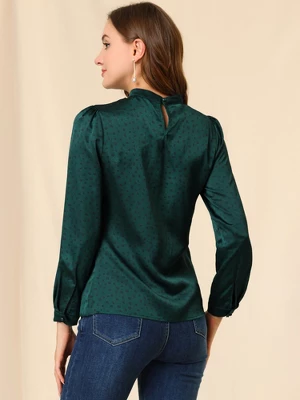 - Satin Blouse, Vintage Dots Print, Puff Sleeve with Button Cuff, Ruffle