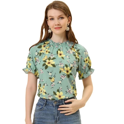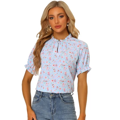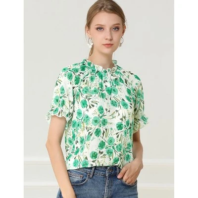 - Ruffle Mock Neck, front Button Loop, Floral Print, Ruffled Short Sleeves with Elastic Cuff