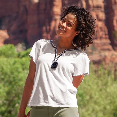 Aventura’s female-led design team matched sustainable materials and delicate, feminine details to create the Kateri Flutter Sleeve Top. The cotton sourced for this top is from Better Cotton Initiative™, which is a global non-profit that teaches farmers how to act as stewards for their water, land, and community. It is considered a sustainable option, as is Tencel™ modal. Together, these fibers create a lightweight, breathable shirt that can stretch, drape, and retain its shape. The details make this top, including split shoulder flutter sleeves finished with stitching details and embroidery around the neck and front placket finished with contrast tie. We love its effortless style when paired with the Blake Wide Leg Pant.