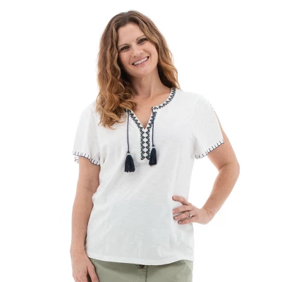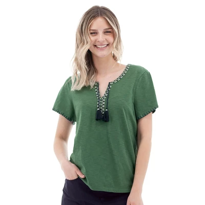 - Embroidery around neck trim and center front placket