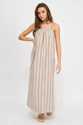 Get ready for summer with this must have sleeveless maxi dress from Emory Park. Featuring a flattering halter front neckline, deep front pockets and a comfortable fit throughout. Made with a durable, soft, striped linen fabric that is perfect for any day of summer. Pair with flats, tennis shoes or sandals to complete your look.