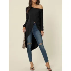 The long sleeve asymmetrical irregular hem top for spring and fall match with any pants, high waits jeans, leggings and shoes like sandal, heels. Perfect for both day and evening occasions, these high low tops for women add a touch of elegant and style to any wardrobe. Off shoulder and asymmetrical hem details add a bit of charming.
