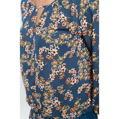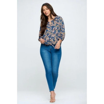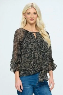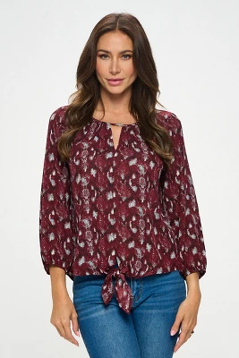 This three-quarter sleeve printed blouse is also one our favorite go-to items! It has a keyhole detail and a tie front knot at the waist. We love this look when paired back to denim as a perfect everyday top. Imported. Material – 100% Polyester Machine washable.